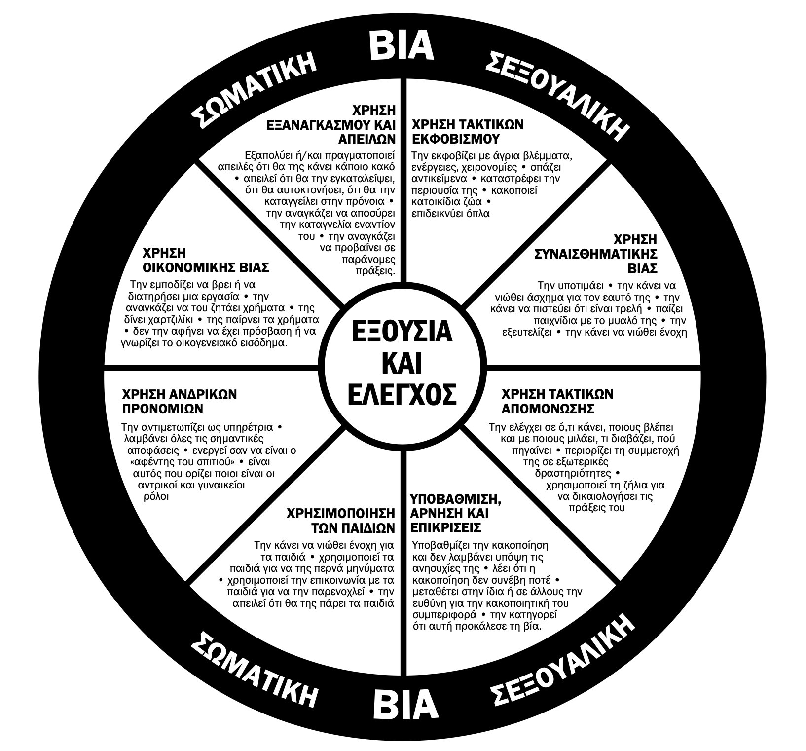 Οι τακτικές εξαναγκασμού αναφέρονται στη χρήση βίας & απειλών με στόχο να εξαναγκάσουν ή να αποθαρρύνουν ορισμένες αντιδράσεις, ενώ οι τακτικές ελέγχου χρησιμοποιούνται για να εξαναγκάσουν το θύμα να υπακούσει, στερώντας του πόρους & υποστήριξη.