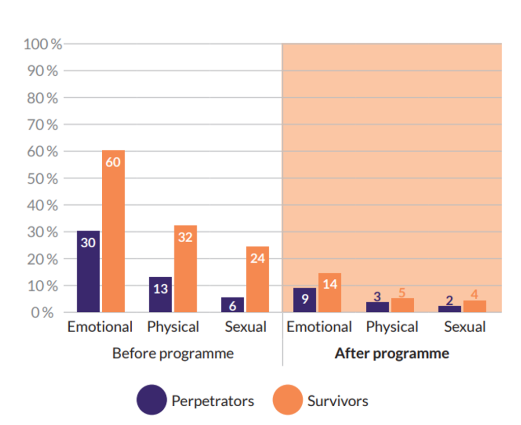 Τόσο οι θύτες όσο και οι (πρώην) σύντροφοί τους αναφέρουν σημαντική μείωση <της συναισθηματικής, σωματικής και σεξουαλικής βίας μετά την ολοκλήρωση του προγράμματος.